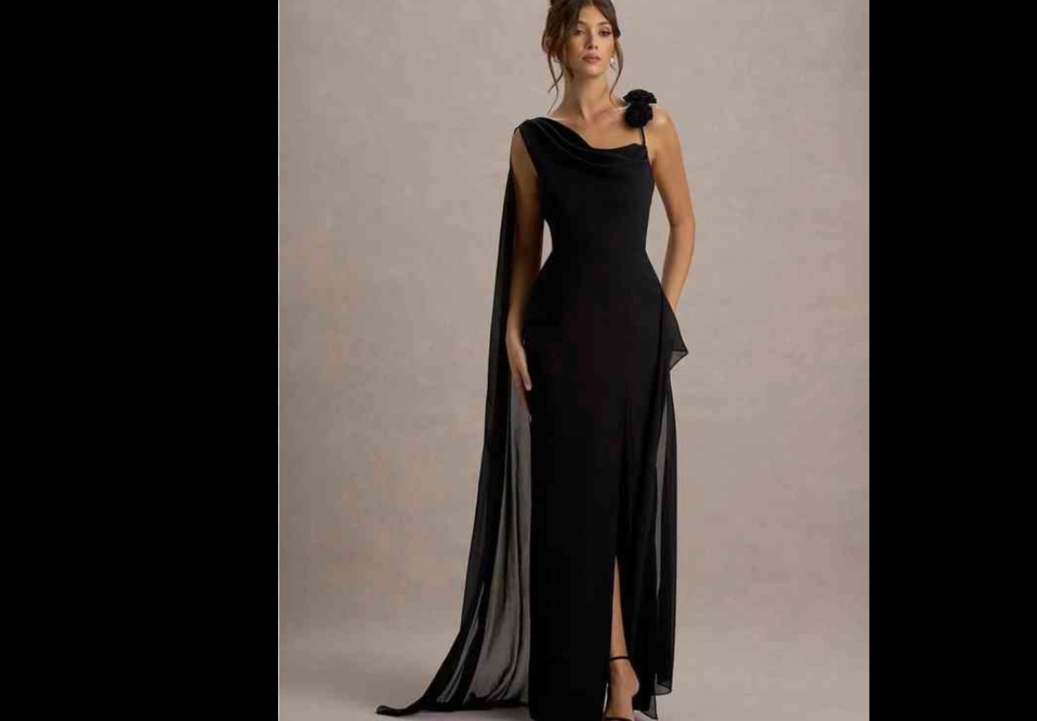 • Accessories, including heels and a clutch bag, complete the look.